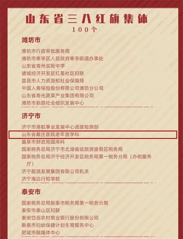 3月2日,山東省婦女聯合會印發《關于表彰山東省三八紅旗手標兵、山東省三八紅旗手、山東省三八紅旗集體的決定》,我院老年醫學科被授予“山東省三八紅旗集體”榮譽稱號,成為全省100個獲此殊榮的先進集體之一。