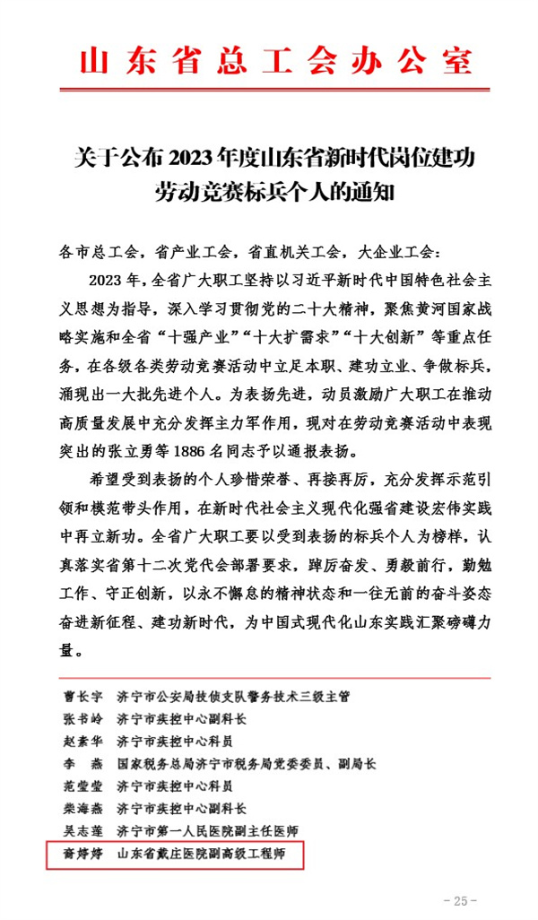 近日,山東省總工會(huì)辦公室下發(fā)《關(guān)于公布2023年度山東省新時(shí)代崗位建功勞動(dòng)競賽標(biāo)兵個(gè)人的通知》,我院裔婷婷榮獲“2023年度山東省新時(shí)代崗位建功勞動(dòng)競賽標(biāo)兵個(gè)人”榮譽(yù)稱號(hào)。