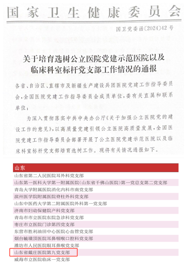 近日,國家衛生健康委公布了《關于培育選樹公立醫院黨建示范醫院以及臨床科室標桿黨支部工作情況的通報》(國衛黨委函〔2024〕42號),山東省戴莊醫院第九黨支部榮獲“全國公立醫院臨床科室標桿黨支部”稱號。