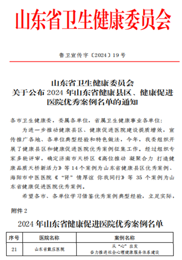 近日,山東省衛(wèi)生健康委公布了2024年山東省健康縣區(qū)、健康促進(jìn)醫(yī)院優(yōu)秀案例名單。我院申報的《從“心”出發(fā) 奮力推進(jìn)社會心理健康服務(wù)體系建設(shè)》獲評2024年山東省健康促進(jìn)醫(yī)院優(yōu)秀案例。