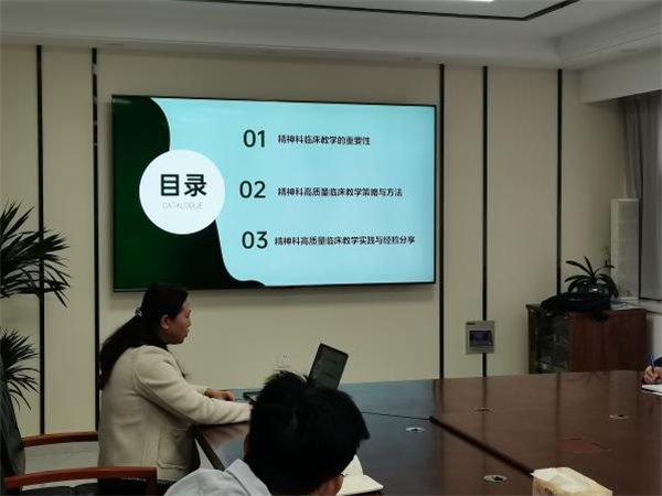 會議由陳敏主持,她強調了教學工作在醫院高質量發展中的重要地位,回顧了醫院過去在教學工作中取得的成績,同時以《如何高質量做好精神科臨床教學工作》為題進行培訓,從精神科臨床教學的重要性出發,深入闡述了精神科高質量臨床教學的策略與方法,進行了臨床教學實踐經驗分享。她指出,要注重臨床教學師資隊伍建設,培養強烈的帶教意識,進行規范化、精細化臨床教學,與時俱進采用多形式的臨床教學方法,加強人文關懷,同時要完善臨床教學評價,提高臨床教學效果,促進學生崗位勝任力的提升。