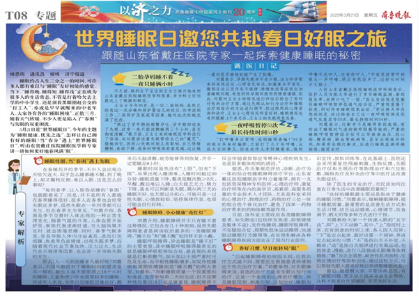 齊魯晚報發(fā)表題為《世界睡眠日邀您共赴春日好眠之旅-跟隨山東省戴莊醫(yī)院專家一起探索健康睡眠的秘密》的文章,睡眠醫(yī)學中心主任劉霞以案說醫(yī),通過孕晚期失眠的準媽媽、鼾癥加重的中年患者等真實案例,剖析春季晝夜溫差與過敏高發(fā)對睡眠障礙的影響,呼吁群眾關注睡眠健康。(線上活動)