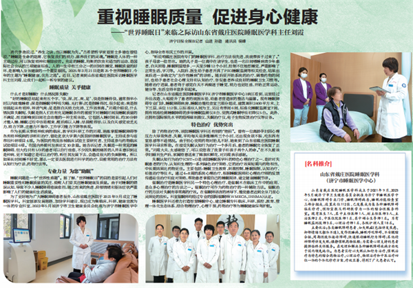濟寧日報發(fā)表題為《重視睡眠質(zhì)量 促進身心健康》的文章,詳述我院睡眠醫(yī)學中心的多學科診療優(yōu)勢及特色療法(如失眠認知行為治療、催眠治療等),提升公眾對睡眠疾病的科學認知。(線上活動)