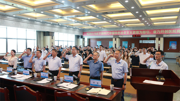 “我莊嚴宣誓:我志愿獻身醫學,熱愛祖國,忠于人民……”在副院長張躍兵的帶領下,全體新入職員工肅然起立,高舉右拳,共同宣誓。鏗鏘誓言回蕩會場,烙印下作為醫者守護生命、不負信任的初心印記。