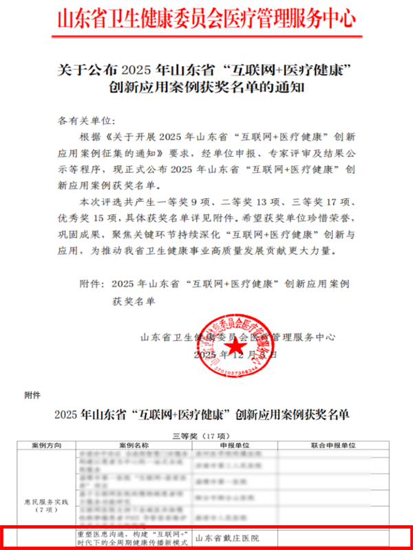 12月3日,山東省衛(wèi)生健康委醫(yī)療管理服務(wù)中心發(fā)布了《關(guān)于公布2025年山東省“互聯(lián)網(wǎng)+醫(yī)療健康”創(chuàng)新應(yīng)用案例獲獎(jiǎng)名單的通知》,我院申報(bào)的《重塑醫(yī)患溝通,構(gòu)建“互聯(lián)網(wǎng)+”時(shí)代下的全周期健康傳播新模式》脫穎而出,榮獲三等獎(jiǎng)。